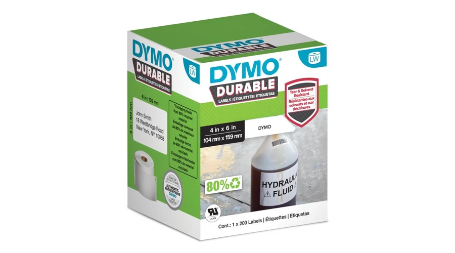 From metal tread plate and textured PVC to wood and glass, DYMO Durable Industrial LabelWriter Labels are the perfect solution for challenging labeling tasks. The industrial-strength adhesive and protective coating resist pealing from abrasion, heat, moisture, solvents and cleaners, making them ideal for shelving, floor markers and chemical storage. The labels are pre-cut for easy application and available in a range of sizes designed for specific tasks. They also use cost-effective direct thermal printing technology that prints without expensive ink or toner. UL recognized as a component to UL 969.